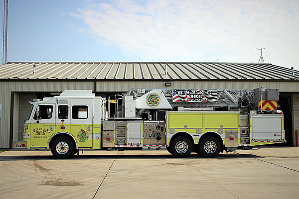 Ladder 351 is a 2012 Rosenbauer. It has a 75′ aerial platform and a 2,000 gpm pump. It also carries 300 gal. of water, light tower and a full compliment of grain bin rescue equipment.